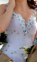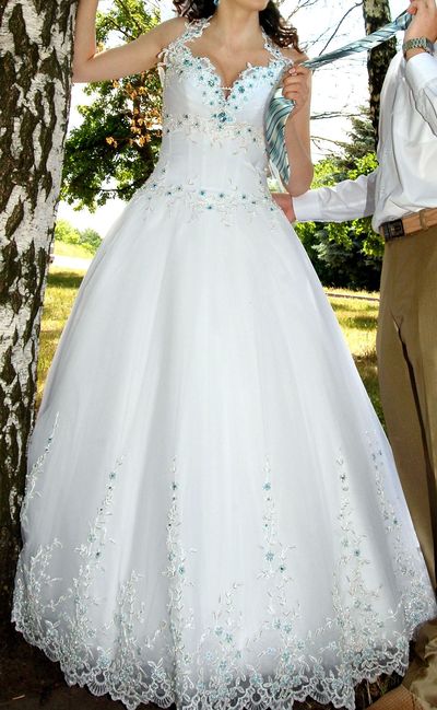 Свадебное платье.Не венчаное Цвет-белый, корсет весь в камнях, низ пышный розшит тоже бисером и камнями. Состояние отличное. Одевалось 1 раз. После химчистки. Корсет и низ платья с апликациями в форме цветов и листьев с камнями сваровски цвета Аквамарин и бисером розшиты на кружеве (ручная работа) очень красиво блестит на солнце. Корсет затягивается под обьём талии. Смотрится просто сногшибательно круги под платье в подарок. Возможен торг |