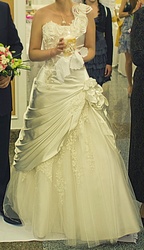 Утонченное, элегантное свадебное платье А-силуэта на одно плечо. Оригинальный, с асимметричными линиями вырез лифа декорирован изумительными цветами ручной работы. Спина полуоткрыта. Расходящаяся от бедер юбка сочетает плавные сборки, собранные сбоку в форме ракушки и кружевные мотивы, подчеркивающие идеальный образ. Платье атласное, с изысканной вышивкой ручной работы, расшито кружевом, бисером и кристаллами Swarovski. Цвет айвори (шампань). Размер 36-40, рост 165-170см. Одето один раз, не венчано. После химчистки в идеальном состоянии. Платье идеально подойдет невесте знающей цену своей привлекательности и красоте. Звоните, пишите (сброшу больше фото). |
