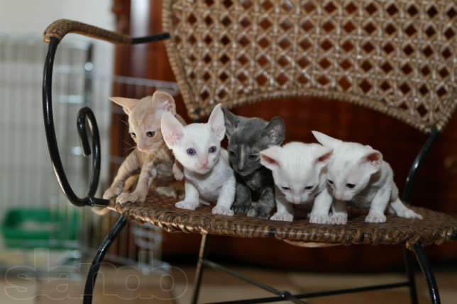 Корниш-рекс Котята породы "Корниш-рекс" дата рождения: 29.02.2012 2-а парня(белый и рыжий) 3-и девочки(две белых и голубо-кремка) |