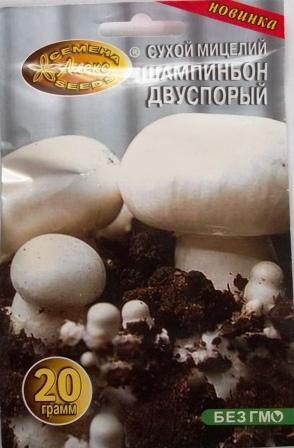 Сухой порошковый мицелий изготавливается по новейшим технологиям, сррок хранения в сухом месте до 10 лет. Упаковка 20 грамм на 3 кв.м. Шампиньоны: двукольцевой, крупноплодный, садовый, белоснежный, лесной, двуспорый. |