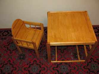 Продам новый столик-стульчик для кормления. Полностью сделан из натурального дерева (сосна), никаких ДСП, МДФ, и тд. Прочный и лёгкий. Покрыт высококачественным лаком. Размеры столика: длинна 560, ширина 540, высота 500. Размеры стульчика: длинна 330,ширина 330, высота 520, высота до сидения 240. На столик легко помещается альбом для рисования, карандаши, и много других нужных ребёнку вещей. 0932624555, 0681117772 Владимир |