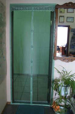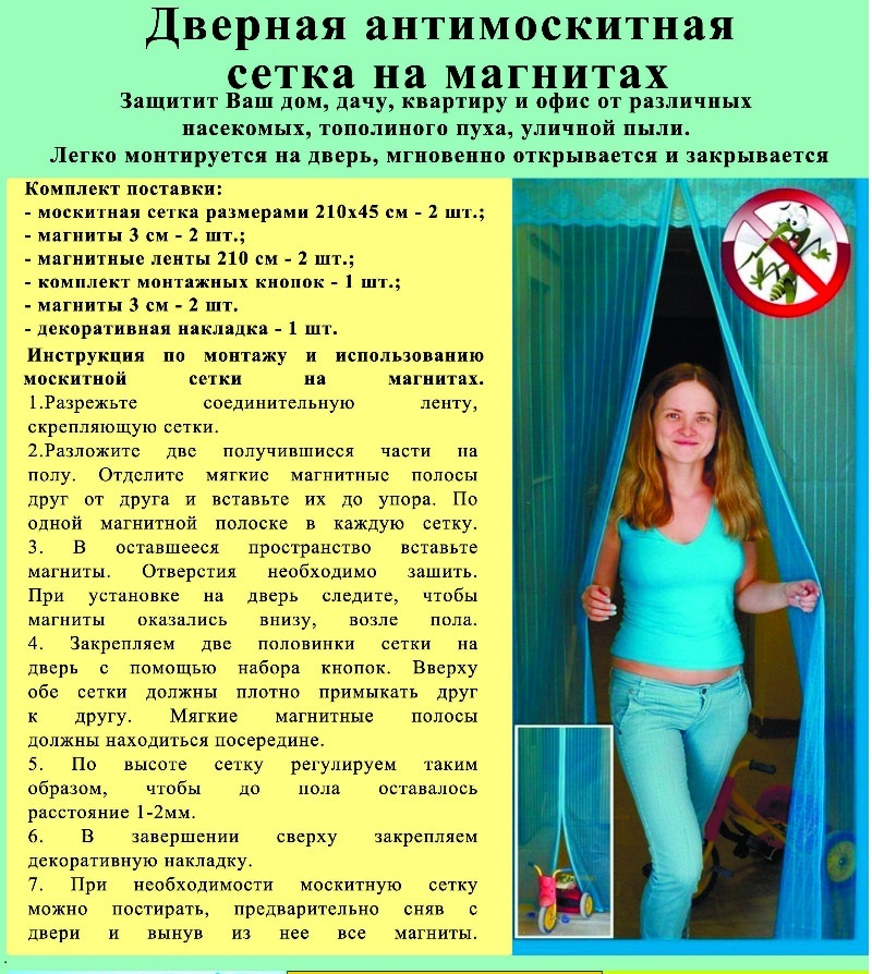 Антимоскитная сетка на магнитах состоит из двух полотен одинакового размера – 200 x 90 см. Магниты, расположенные по краям полотен, позволяют беспрепятственно пройти через дверной проем и закрываются сразу за вами, не пропуская насекомых.