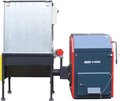 Котлы используют для отопления жилых домов и других помещений. Это современные, полностью автоматизированные отопительные установки, которые могут работать на номинальной мощности без дополнения топлива не менее 3 суток. Основные достоинства котлов: в котлы вмонтированна горелка PellX механизирована подача гранулированного топлива из бункера в котёл стабильный процесс горения при минимальной мощности экологическое топливо - гранулы из опилок, торфа и др. возможность топки дровами или другим твёрдым топливом программируемый пульт управления обеспечивает и контролирует: - подачу оптимального количества тепла в отопительную систему в зависимости от времени суток (недели), температуры и теплового сопротивления здания - температуру возвратной воды в пределах 55-60°С невозможность распространения горения из горелки в бункер, так как гранулы сыпятся по пустому рукаву вниз лёгкая и удобная чистка котла защита от аварийных режимов толщина металла корпуса - 6 мм Технические характеристики: Номинальная теплопродуктивность, кВт 50 Расход топлива (калорийность 15,8 МДж/кг), кг/час 12,9 Обогреваемая площадь (при коэффициенте теплопроводимости 2,5), м2 220…700 Объём воды в котле, л 186 Максимальная длина дров, см 57 Рабочее давление не более, МПа (кг/см2) 0,15 (1,5) Коэффициент полезного действия, % 87 Ёмкость бункера, м3 0,9 Длительность горения одноразовой загрузки, час 49 Эл.мощность, 220В 50Гц, не более, Вт 630 Минимальная тяга дымохода, Па 25 Размеры трубы дымохода, мм Ø198 Сечение патрубка входа/выхода G2’’ Габариты котла без бункера: 1230х940х1210 Вес, кг 800
