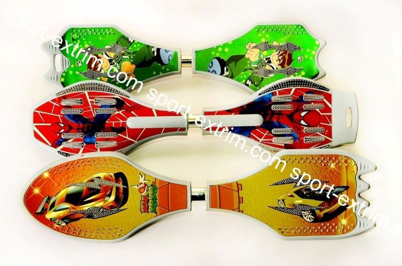Двухколесный скейтборд сделан из легкого, но прочного и гибкого пластика. Его основа – две соединенные платформы, с прикрепленными легко поворачивающимися колесами. Обе пластиковые платформы скреплены специальной пружиной, для высокой маневренности.