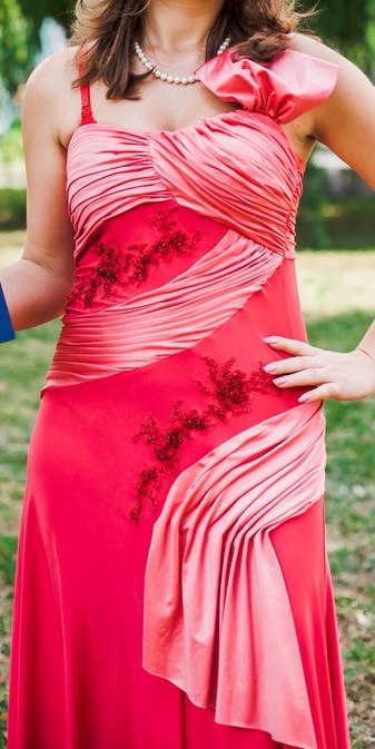 выпускное платье в пол было одето 1 раз на выпускной в университете. платье розового и бордового оттенков(атласное) в отличном состоянии, обшитое бисером.платье на одной шлейке с левой стороны |