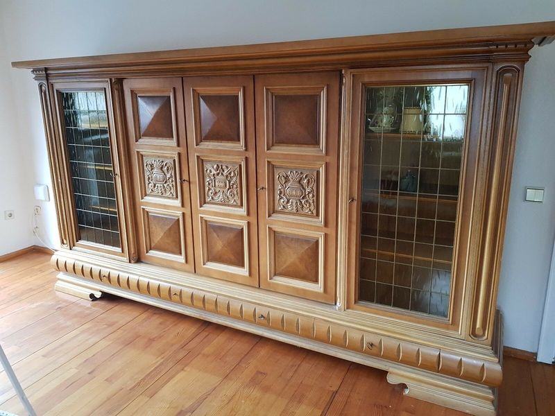 - Вітрина та тумба-бар Неоренесанс, «на лев’ячих лапах», оздоблені об’ємною різьбою ручної робити, масив дуба.